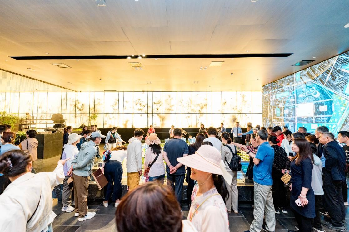 開(kāi)放當天,以“宋風(fēng)美學(xué)館”為核心的展示體系全面啟用。從歸舟石陣、夢(mèng)溪水廊、泗水庭院,到云階劇場(chǎng)、竹影茶敘、萬(wàn)卷書(shū)吧等11大生活化場(chǎng)景實(shí)景呈現,客戶(hù)在參觀(guān)中沉浸式體驗了我司“文化+生活+空間”三位一體的美學(xué)產(chǎn)品表達力。館內所展《清明上河圖》《千里江山圖》等七大國寶宋畫(huà)數字互動(dòng)內容,也進(jìn)一步強化了項目文化辨識度。